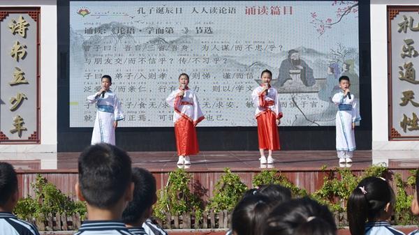 “学而时习之,不亦说乎?”“己所不欲,勿施于人”……在四名小领读员的带领下,全校师生齐声诵读《论语》经典篇章。琅琅书声,声声入耳;句句经典,字字入心。从低年级的童声稚语到高年级的沉稳诵读,每一个孩子都在与先贤对话中汲取智慧,在诵读中涵养品德。