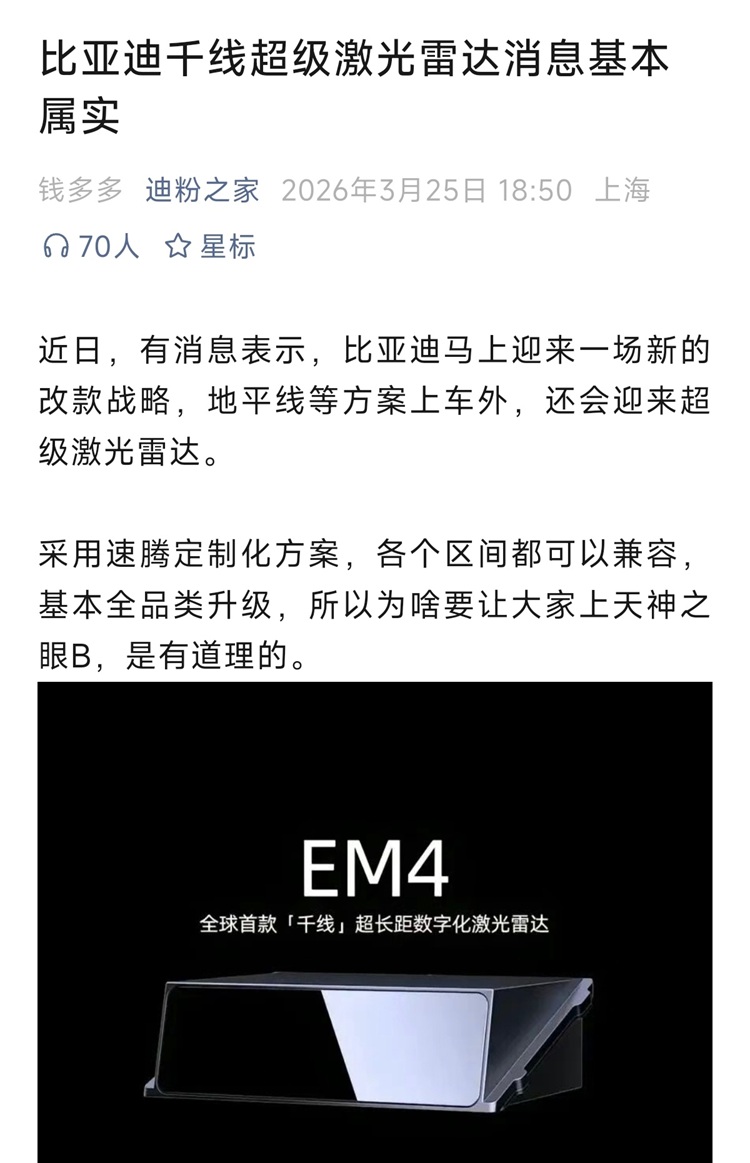 就在昨天,有供应链的消息流出:比亚迪高端车型要上的是速腾聚创的EM4数字化激光雷达,这款产品支持从520线到2160线的定制化方案,最远探测距离可达600米。